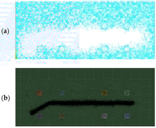 The mesh employed in this study is a quadrilateral free mesh, with a mean element size of 1 mm for the cooling channels and molds, and 0.0625 mm for the portion. Despite the utilization of identical mesh parameters in both modules, there exists a notable disparity in the overall quantity of mesh components between Workbench and Mechanical APDL. The numerical values 82,871 and 151,885 are being referred to in the context of Workbench. The mesh seen in Figure 2a,b was generated with the Mechanical APDL and Workbench 2020 R2 software.