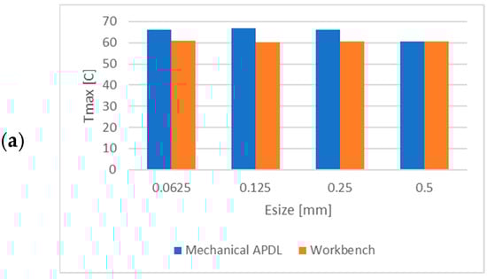 Figure 3 shows the results of the sensitivity analysis for the maximum value of the temperature Tmax, for different element sizes and for both ANSYS Mechanical APDL and Workbench.