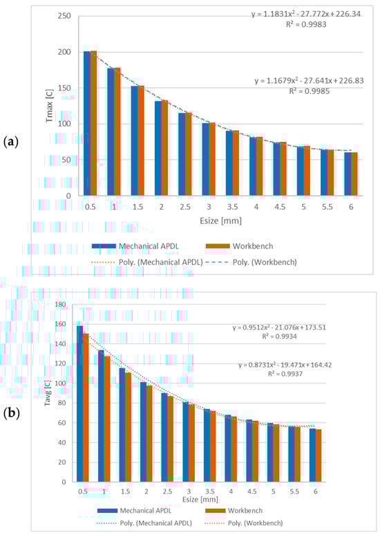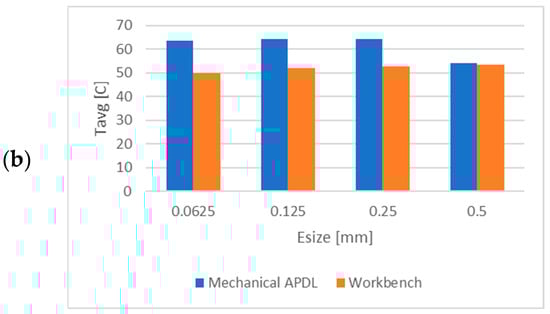Figure 4 illustrates the discretization inaccuracy in Mechanical APDL and Workbench, specifically in relation to the maximum (a) and average (b) temperature. The findings presented in Figure 4 were obtained by utilizing the data from Figure 3 and applying Equation (1).