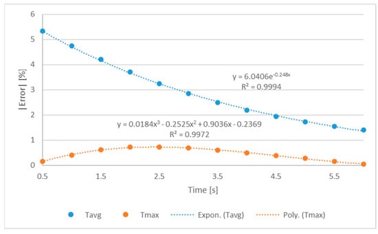 As depicted in Figure 6, the temporal inaccuracy can be adequately modeled using a third-degree polynomial function for the maximum temperature (Tmax) and an exponential function for the average temperature (Tavg). According to Figure 6, the quadratic correlation value exhibits a high degree of proximity to 1. As the study presented is purely numerical, it can be applied to parts manufactured in other ways, although in real applications, conformal cooling channels will definitely be of value due to the much larger freedom in manufacturing the desired geometry,