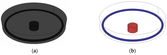 A commercial finite element software, COMSOL Multiphysics 3.5 ™ [], was utilized to perform a three-dimensional simulation. Initially, the cell’s geometry was replicated in a 3D model, depicted in Figure 1a. The electrolyte was represented as a cylindrical structure containing both anode and cathode electrodes (Figure 1b). The working electrode (Figure 1b, red) was in contact with the electrolyte on a single surface, while the counter electrode (Figure 1b, blue) was emulated with a metal ring placed within the electrolyte cylinder. The research focused on the primary current due to its dependence on electrode geometry and arrangement.