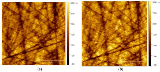 Imaging of the in situ deposited nanoparticles using AFM. (a) Scan of the surface at OCP; (b) scan of the surface at −1.00 V vs. Ag/AgCl/NaCl (3M) for 100 s.