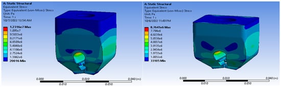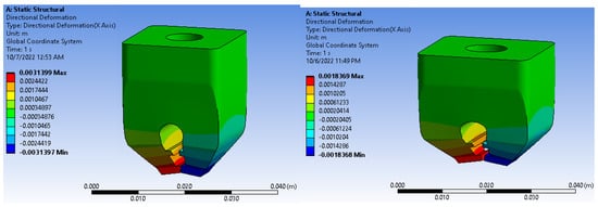 Figure 2 and Figure 3 compare the results of the initial model with those of the optimized model, whose parameter values are shown in Table 1. Figure 2 shows the Linear deflection (x axis) for the optimized model (left) and for the initial model (right). Figure 3 shows the Huber–Mises strength for the optimized model (left) and for the initial model (right).