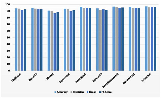 Upon the completion of both experiments for breast cancer detection utilizing a two- class dataset (normal and disease), following the architectural hyperparameters of BCDecNet outlined in Table 2, the proposed classifiers demonstrated outstanding performance in detecting breast cancer. The comprehensive performance metrics of the proposed classifiers, including the newly developed model (BCDecNet) and different hybrid approaches in breast cancer detection, are presented in Table 3. We have also evaluated the performance of each model, and the graphical representation for each model is presented in Figure 3.