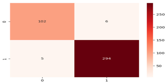 The main goal of these experiments is to demonstrate the effectiveness of our method in breast cancer detection. A total of 2039 histopathological images were utilized, with 1631 images designated for training and 408 images for model validation. The training and validation sets were employed to train and validate our model. The training duration for breast cancer detection amounted to 679 min and 10 s. Upon completing the experiment, our analysis indicates that our proposed BCDecNet model surpasses other models. The confusion matrix (CM) for binary detection is presented in Figure 4, where off-diagonal terms represent inaccurate predictions, and diagonal terms indicate correctly recognized breast cancer images. To evaluate the training performance of the proposed model in breast cancer detection, we have illustrated accuracy and loss in Figure 5 after 100 epochs. The newly developed BCDecNet model achieved 97.33% accuracy, 96.0% precision, 96.5% recall, and 96.25% F1-score values, which are the highest among all the models we have utilized in this breast cancer experiment. Hence, it is proved that our proposed model, BCDecNet, achieved superior accuracy when compared to all other hybrid approaches.
