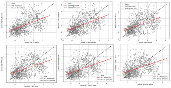 Comparing surface reflectance values from S2 and L9 data over the same geographic area. Common bands such as blue, green, red, NIR, SWIR-1, and SWIR-2 are typically selected in both domains. This uniform band selection ensures that the spectral information used for comparison is consistent across different data sources. In all plots, the x-axis represents the L9 values, and the y-axis represents the S2 values.