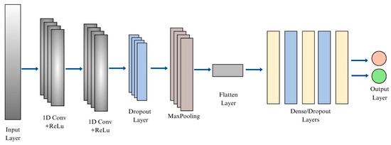 1D convolutional neural networks (CNNs) are used here as shown in Figure 2. They consist of two consecutive 1D convolutional layers, followed by one dropout and one max-pooling layers; then, features are flattened to be injected in classical classifiers multiple layer perceptron (MLP).