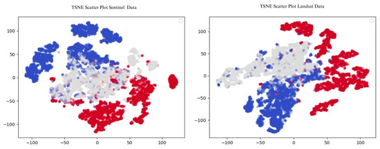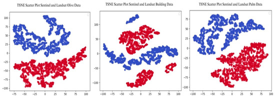 The distribution of the three classes (olive, building, and palm) in Sentinel and Landsat data was visualized using t-SNE plots in Figure 3 and Figure 4, which condensed the multidimensional information into a clear two-dimensional representation. This revealed how the classes were distributed and related. The olive class was notably positioned in close proximity to the building and palm classes, suggesting that it shares certain common features or characteristics with the other two classes.