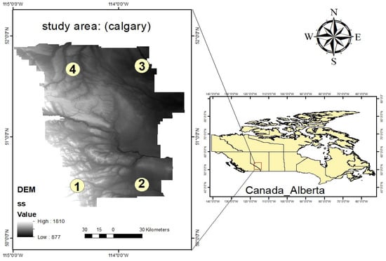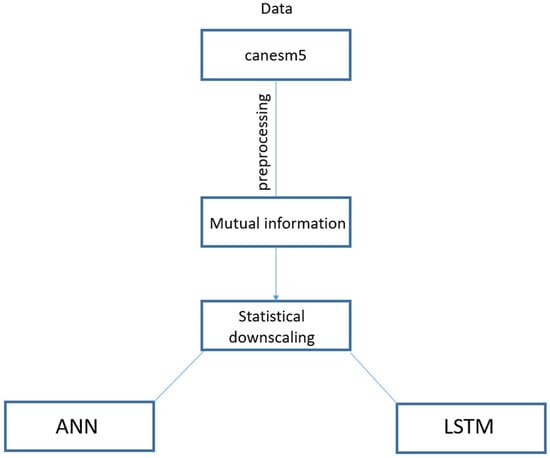The study area for this research is Calgary, located in the province of Alberta, Canada. Calgary is situated at coordinates 51.0447 degrees north and 114.0719 degrees west, with an elevation of 1100 m above sea level. The city experiences cold winters and mild to warm summers, with an average annual temperature of around 9 degrees Celsius. Annual precipitation in Calgary is approximately 425 mm, distributed throughout the year. The land use distribution in Calgary is as follows: agricultural activities occupy about 30% of the total area, while forested areas constitute around 20%, urban areas cover approximately 40% of the study region, consisting of residential, commercial, and industrial zones. Barren land, such as rocky terrain or areas with limited vegetation, accounts for roughly 5% of the total area. The remaining 5% includes water bodies, wetlands, parks, and protected areas. In terms of the socioeconomic context, Calgary has a diverse economy with key sectors including oil and gas, technology, finance, tourism, and transportation. Figure 1 shows the study site with the elevation map. The data used in this research is from the Can_ESM5, which is from www.canada.ca (accessed on 30 January 2023).This information includes variables such as climatic, humidity, temperature and pressure type predictors for the period from 1979 to 2014, as well as observational data from www.acis.alberta.ca (accessed on 20 January 2023); which process is depict in the Figure 2.