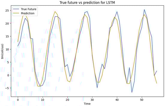 Based on the MI screening results, the selected climate parameters were used as input for LSTM and ANN models. Based on Table 2, the results show that the LSTM model has a better ability in recording the historical temperature trend compared to the ANN model. The superiority of the LSTM model can be attributed to its deep layers and frequent connections. Deep layers allow the model to learn complex patterns and relationships in the data, while frequent connections enable error correction and integration of information from previous layers. In contrast, the ANN model, with a hidden layer, is limited in its ability to capture complex relationships. Therefore, the LSTM-based network is a more effective method for simulating historical temperature trends. The findings of this study show the effectiveness of the LSTM model as a reference model for the purposes of simulation and impact assessment in the Calgary region. The LSTM model’s ability to accurately capture historical temperature trends can provide valuable insights for climate-related studies and decision-making processes. The graph of the LSTM model results is shown in Figure 4.