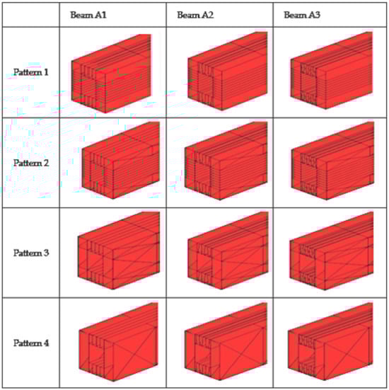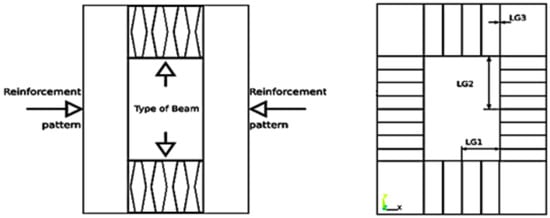 For the purpose of the analysis of dynamic behavior,12 finite element method (FEM) models were designed in the ANSYS Mechanical APDL. These models represent different versions of the project of novel beams. They are composed of two sandwich panels on the top and on the bottom, and a reinforcement pattern on the sides, as shown in Figure 1: Such models were earlier discussed by the authors in other application aspects [,,,,]. Simple hollow-box beams, named hollow-solid sections, and abbreviated HSS in the results were also studied, using the same conditions as on the sandwich beams. The variables for the studied beams are shown in Figure 1 (right).