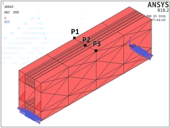 Despite the variance in the geometric variables, these spots were selected at locations where all coordinates remain constant. By doing this, the findings are not directly impacted when the design factors are changed. The approach used in this work’s MATLAB-based Finite Element Model Updating tool was first created in [] for structural dynamic analysis. Additionally, in [,], it was modified for structural static analysis. In this work, Equation (1) served as the goal function that the MATLAB code used to optimize the models, as in [,].