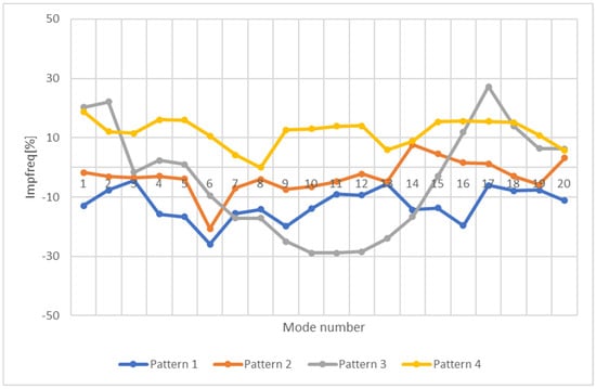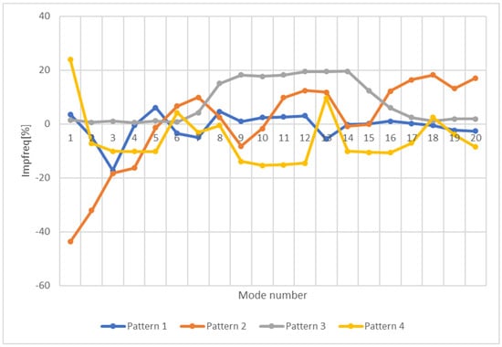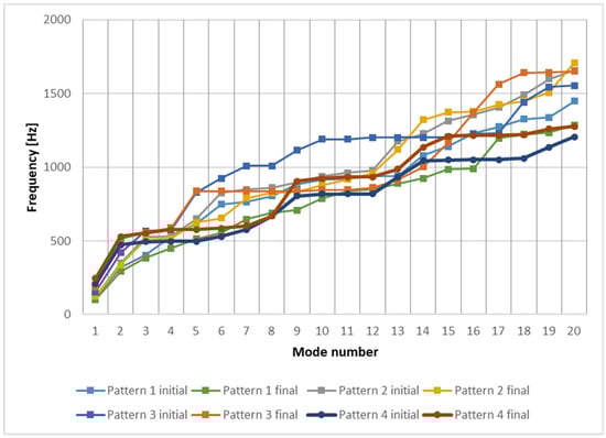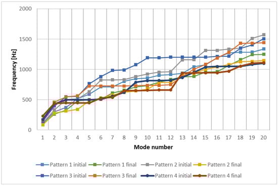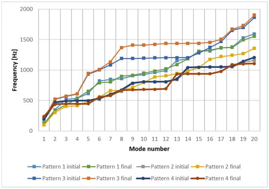 It can be seen that all the beams behave similarly in terms of their dynamic response. The frequency range surpasses 1800 Hz for beam A1 pattern 3 final (optimized), shown in Figure 6. It is the maximum value of frequency obtained for all the models. Beam A3 pattern 4 (Figure 8) is the model that behaves best, as the highest maximization of frequencies can be obtained considering all models. The dynamic response of a structure, in terms of natural frequencies, is very important in structural analysis. It is known that lower frequencies are more energetic, and, therefore, they are known to be more prone to disrupt the adequate operation of applications involving high accelerations and comprising lightweight mobile parts. The dynamic behavior can be improved if the natural frequencies of the optimized models can be maximized in comparison with the initial ones. It can be seen from beam A1, whose results are shown in Figure 9, there is an improvement for Patterns 1 and 3. Pattern 4 presents an advantage only for some modes, and Pattern 2 is causing an overall worsening. For beams of the A2 type, shown in Figure 10, there is an overall improvement for Pattern 4, while Pattern 3 gives that only for some modes, and Patterns 1 and 2 present an overall worsening. Beams of the A3 type, shown in Figure 11 present an improvement for some modes for Patterns 3 and 4 and an overall worsening for Patterns 1 and 2.