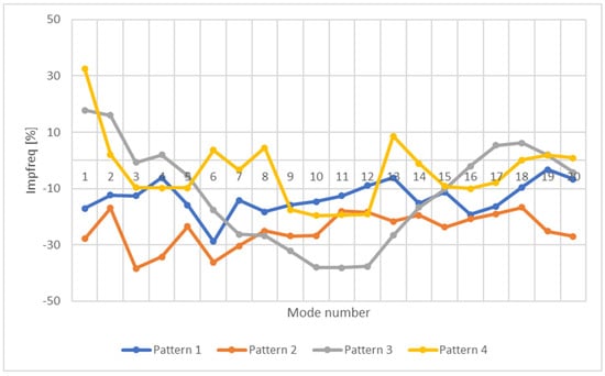 In order to study the dynamic response of the beams, modal analyses were performed. The modal extraction method was Block-Lanczos, with a frequency range between 0 and 20,000 Hz. The first 20 modes were expanded, and their eigenvalues collected. The results are shown in Figure 6, Figure 7, Figure 8, Figure 9, Figure 10 and Figure 11. The results regarding the dynamic behavior presented in Figure 6 and Figure 7, were compared by means of an improvement factor:
