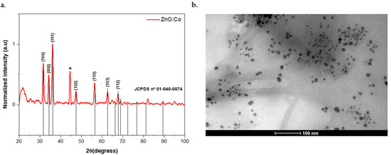 ZnO:Co nanoparticles were prepared by dissolving ZnCl2 (2 mmol), CoCl2·6H2O (0.10 mmol), and mercaptosuccinic acid (MSA) (8 mmol), acting as a surface stabilizing agent, in 50 mL of deionized water, and the pH of the solution was adjusted, under constant stirring, to approximately 11 with a solution of NaOH (4 M). The system was maintained under constant stirring at a temperature of 80 °C for 90 min [7]. After the end of the synthesis, the colloidal suspension was frozen to promote colloidal destabilization. After thawing at room temperature, the precipitate was purified and washed with distilled water and ethanol using a porous plate funnel for filtration. Subsequently, the material was dried in an oven for 1 h at 120 °C, followed by the calcination of the material in a muffle furnace for 2 h at 300 °C [8,9]. For the structural and morphological characterization of ZnO:Co NPs, X-ray diffraction (XRD) and transmission electron microscopy (TEM) analysis were performed.