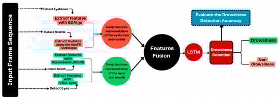 To effectively extracts the deep feature representation of the driver’s eyebrows, nostrils, eyes, and mouth from a given consecutive frames in NTHU-DDD dataset. We detect different alterations and changes in facial expressions, specifically focusing on the region of interest (i.e., eyebrows, nostril, eyes, and mouth). These alterations are considered as modifications in shape or movement on driver’s face. In response to these changes, we proposed two techniques; EDAlgo and NoSFE techniques to extract the drowsiness features of the eyebrows and nostrils. Also, we adopted additional two methods Squeezenet_Mouth and VGG_eyes to extract drowsiness features of mouth and eyes respectively, enabling the identification of the driver’s state.