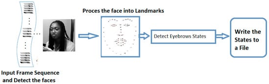 EDAlgo depicted in Figure 3 aimed at extracting eyebrow states (raised or lowered) within processed facial landmarks, specifically focusing on the region of interest, corresponding to the eyebrows. The algorithm takes processed facial landmarks as input and generates an annotated list highlighting the changes in the eyebrow region, indicating whether they are raised or lowered.