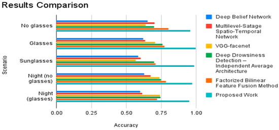 In Table 2, the proposed model achieves a significantly higher accuracy of 0.96 compared to the state-of-the-art models (ranging from 0.638 to 0.802), showcasing its superior capability to detect drowsiness when drivers are not wearing glasses. The proposed model outperforms all state-of-the-art models with an exceptional accuracy of 0.997, surpassing the range of 0.623 to 0.774 observed in the other models. This highlights its robustness in accurately detecting drowsiness even when drivers wear normal glasses. Again, it achieves a remarkable accuracy of 0.989, outperforming existing models that range from 0.570 to 0.709. This underscores its effectiveness in handling drowsiness detection under various eyewear conditions. It also demonstrates a high accuracy of 0.972, surpassing the range of 0.630 to 0.785 observed in state-of-the-art models. Its effectiveness in low light conditions without glasses is notably superior here. Finally, it achieves a strong accuracy of 0.951, outperforming the range of 0.602 to 0.741 seen in other models. This emphasizes its robust performance in night time scenarios even when drivers wear glasses (Figure 5).