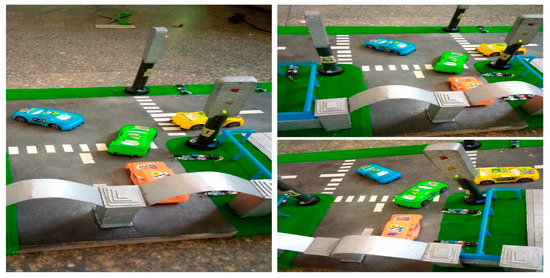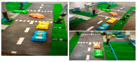 In Figure 3, after 30 s, the green light on lane C turns OFF, while the yellow light on lane B and A turns ON. This process occurs continuously, while vehicle riders also see the red laser light from the front of the stop lane road.