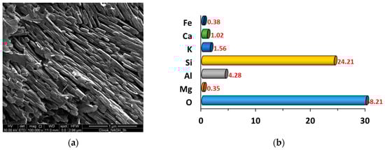 Figure 2b), the result being 5.6, which is a characteristic value for this mineral. In addition, the chemical analysis of the clinoptilolite sample performed via EDS has shown that K