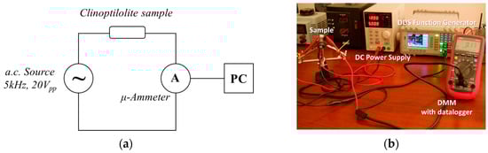 + is the principally involved charge carrier) has been investigated by monitoring, during a rapid heating process, the variation in the effective current intensity flowing in the sample, biased by a constant a.c. sinusoidal voltage value. In particular, the small piece of clinoptilolite was polarized by using an a.c. voltage source (sinusoidal voltage signal of 20V