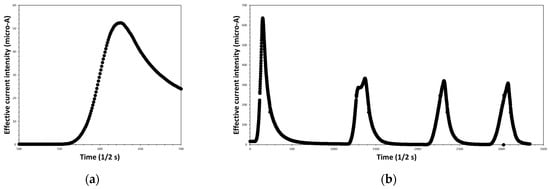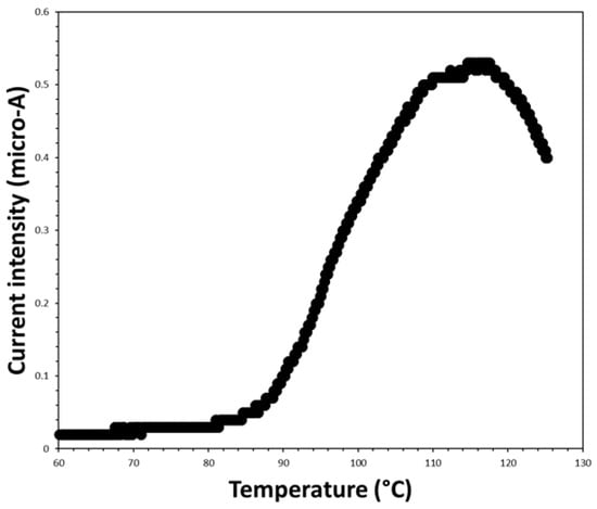 Figure 4a, the application of a thermal pulse to the clinoptilolite monolith promptly generates an electrical micro-current in the ceramic sample. Such a micro-current built up with the turning-on of the lamp. During the successive cooling step in air (i.e., the turning-off of the incandescent lamp), the micro-current intensity readily decreased until reaching the starting negligible value. The resulting peak in the current intensity had a slightly asymmetric profile since the process of the sample cooling in air resulted in being slower than the previous heating process. In particular, the heating step followed a linear law, while the cooling step followed a parabolic law.