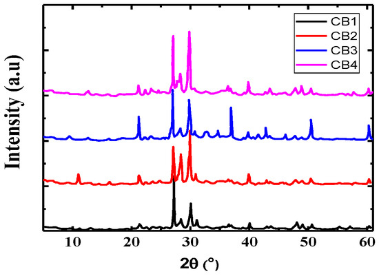 XRD measurements of our samples are shown in Figure 1. The observed diffraction peaks show a low intensity of Ca/Si for all the samples studied. It can be noted that the Ca/Si ratio is one of the factors contributing to the compressive strength. According to Tob’on et al. [24], the amount of Ca/Si is the main parameter at later hydration ages. The spacing values obtained at the Ca/Si vertex are highly correlated with the results obtained [25]. According to the XRD analyses, the trend of the maximum Ca/Si values is in good agreement with the compressive strengths and the Ca/S ratio.