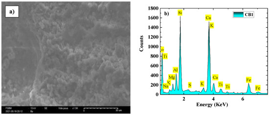 (a) Scanning electron microscopy SEM and (b) Energy Dispersive X-Ray Analysis (EDX) of concrete slab specimen (CB1).