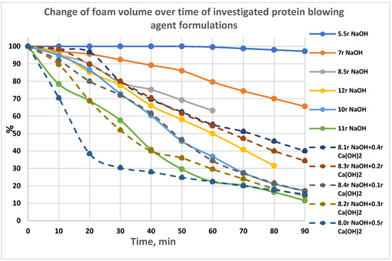 The change of foam volume over time of investigated protein blowing agent formulations.