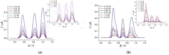 Both sensors provided a highly sensitive response to target analytes in the differential pulse voltammetric mode (Figure 1). Taking into account the shape of voltammograms for the mixture of hydroxycinnamic acids, the peak area was used for calibration plot fitting. The analytical ranges of 0.10–2.5 µmol L−1 and 2.5–100 µmol L−1 for CA, 0.10–2.5 µmol L−1 and 2.5–50 µmol L−1 for both FA and p-CA s using polyPR-modified electrode were obtained. The detection limits of 48, 22, and 38 nmol L−1 were achieved for the CA, FA, and p-CA, respectively. Polyaluminon-based sensors allowed the determination of 0.10–2.5 and 2.5–25 µmol L−1 of both flavanones. The detection limits were calculated as 29 and 20 nmol L−1, respectively. The analytical characteristics obtained using polymer-based sensors are meaningful and improved compared to those presented in Table 1.