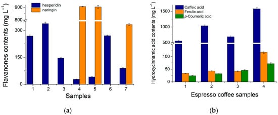 Phenolic antioxidants of various groups are important nutrients in the human diet providing positive health effects []. Nevertheless, these effects are dose dependent and require the control of natural phenolic contents in their sources []. Coffee and citrus juices containing significant amounts of hydroxycinnamic acids [] and flavanones [], respectively, are among the most widely consumed beverages all over the world.