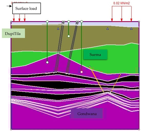 For each stratigraphic segment, the following properties are taken into account: unit weight, initial water condition, Poisson’s ratio, Young’s modulus, peak friction angle, peak tensile strength, cohesion, fluid bulk modulus, and porosity. The value of the unit weight, initial water condition, Poisson’s ratio, Young’s modulus, peak tensile strength, and cohesion are available from the tested borehole samples [3]. The fluid bulk modulus value is calculated using the elastic modulus and cohesion value [17]. The porosity value of Khalashpir coal basin is predicted by correlating with the other nearby Gondwana coal basins, considering the depth, groundwater conditions, fault locations, and other geotechnical parameters [18].