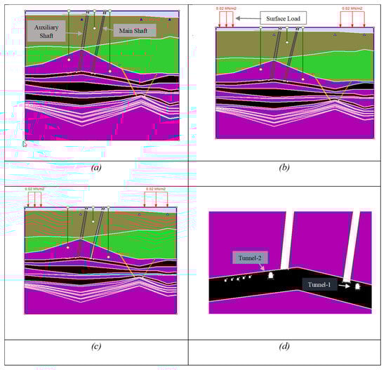 This study involves establishing seven stages (Table 2), including the initial, surface load, main shaft, auxiliary shaft, tunnel 1, tunnel 2, and recovery phase of five longwall panels. Figure 3 shows the initial, surface load, main shaft, and recovery stage.
