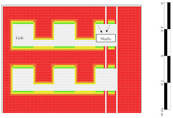 An RMR value of 50 was employed for the Khalashpir coal basin based on the depth and geologic and hydrogeologic condition by correlating with the other Gondwana coal basins. The RMR and rock mass modulus relationship of Beinwiawski and the RMR value of 50 correspond to 13,000 MPa [25]. The concept of lamination thickness is that the coal is interpreted using a large number of grids to assess vertical stress, seam convergence, and strain safety factors using governing equations and statistical methods. Table 4 tabulates the properties of the lamination wizard. In this case, seam Ⅰ with a thickness of 10 m is considered to be 70 m in 70 grids along the y-axis. The coal is considered to exhibit an elastic-plastic behavior, and the strain-hardening gob is the most appropriate fit for this case (Table 5) [26].