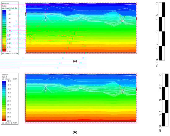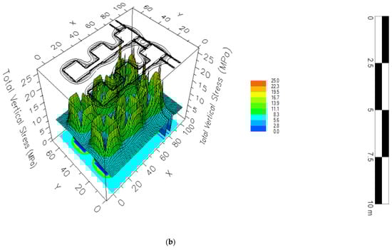 The Mohr–Coulomb criterion is a set of linear equations in principal stress space describing the conditions for which the isotropic materials will fail, which is expressed as a function of Φ1 and Φ3 and a widely accepted failure criterion to simulate geotechnical hazards [27,28]. This case study applies the Mohr–Coulomb failure criterion in both the finite element method (FEM) and boundary element method (BEM) to generate the major principal stress (Φ1) and minor principal stress (Φ3) using the RS2 finite element package and total vertical stress through the calibration of LaModel, which is a boundary element package, respectively. The RS2 finite element model shows Φ1 and Φ3 (Figure 5) values of the initial stage at steady-state groundwater conditions. The total vertical stress can be calculated from the figures at any depth by averaging Φ1 and Φ3. The estimated total vertical stress is 9.5 MPa at a depth of 245 m from the surface, denoting the longwall retreat’s edge.