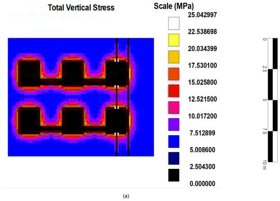 The boundary element package LaModel simulates the total vertical stress, which combines overburden load, multiple seam stress, and abutment load, utilizing an empirical equation developed by Heasley [29]. The total vertical stress plots show that the stress in the supported zones is lowest and increases significantly with longwall retreat (Figure 6). At a depth of 245 m, the total vertical stress is observed to be 25 MPa.
