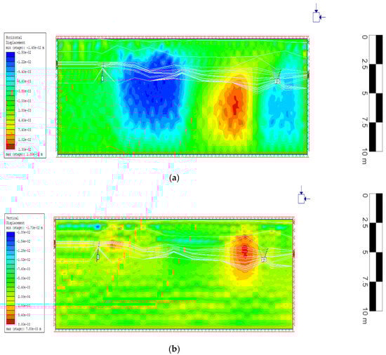 The characteristics of slope displacements can be assessed by predicting horizontal and vertical displacements caused by the weight of the body and acting on the slopes and caves [30]. The movements of rock strata can be described as horizontal and vertical displacements that largely vary due to the magnitude of the modulus of elasticity [31].