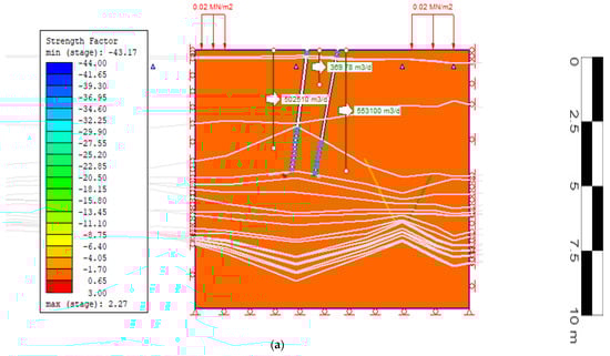 Figure 9b presents the strain safety factor using the boundary element method (BEM), and the factor of safety values range from 0 to 2.85. For stable geometry of the formation, this model requires a safety factor value of 2.05, at which a 90% success rate is observed [34]. In the simulation, a safety factor value of 0.7 is observed near the longwall retreat at a depth of 245 m. However, shafts with artificial ground freezing techniques to increase strength and decrease water mobility, and tunnels with rock bolting rather than concrete or shotcrete, have been proven effective in the other local mines [2]. The tunnels in the regional mines with rock bolting reinforcements have shown very slight displacements and the shafts have remained stable, although ground attenuations are a common scenario in the mine’s nearby areas.