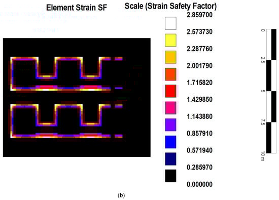 (a) Spatio-temporal strength factor of recovery stage relative to tunnel 2 using Mohr–Coulomb failure criteria (scale bar 1: 55.38). (b) The strain safety factor in the square plot using Mark Beiniawki pillar strength equation (scale bar 7:1).