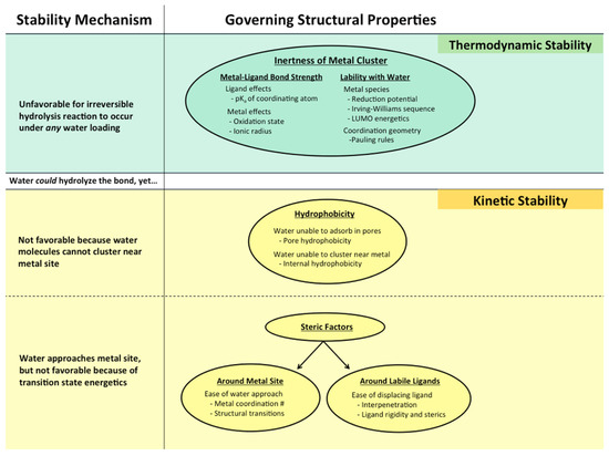 The stability of MOFs is influenced by a number of parameters, although the majority are kinetic and thermodynamic in nature. The strength of the metal–ligand coordination bond is the primary thermodynamic factor. The linker’s rigidity, coordination number, surface hydrophobicity, and framework interpenetration are all kinetic factors. Figure 1 shows the stability mechanisms of MOFs and the governing structural properties for each mechanism.