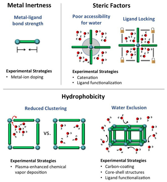 Mechanisms for improving the water stability of existing MOFs. Reprinted with permission from [25]. Copyright: 2014 American Chemical Society.