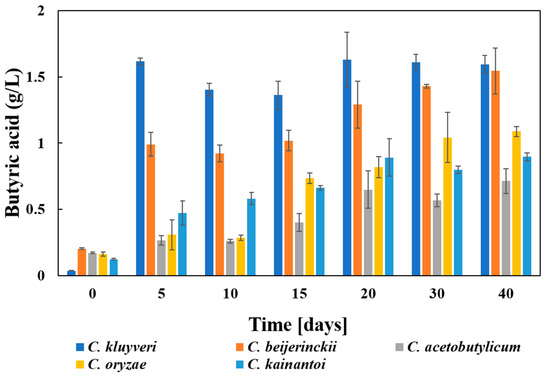 In the first experiment, all the strains produced significant amounts of C4. On the 40th day, C. beijerinckii produced 1.54 g/L of C4, which is almost equivalent to the production capacity (1.63 g/L) of C. kluyveri (Figure 2). However, the maximum C4 production was accomplished within 5 days when C. kluyveri was used. This result indicated that C. kluyveri is the most useful bacterium among the tested Clostridium group.