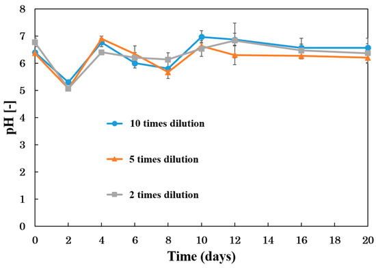 It has been reported that C. kluyveri can grow within pH range of 6.0–7.5, and that the optimum pH is 6.4 [18]. Therefore, pH measurement was performed to examine the change in pH. When the pH was below 6.0, pH adjustments were made with 5 M NaOH. Figure 3 shows the changes in pH values over the time in diluted cheese whey. Although the pH was 6.4 after the start of the culture, it decreased to pH 5.0 on the second day, so the pH was adjusted. After that, the pH was 6.0 or higher until the 6th day, so the pH was not adjusted. On the 8th day, the pH decreased to 6.0 or less, so the pH was adjusted again, no pH adjustment was performed afterwards. Interestingly, the difference in pH fluctuations pattern was insignificant at any dilution rate.