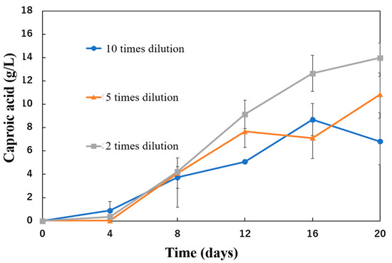 On the other hand, C6 was not observed when raw CW was used. However, mixed bacterial culture produced 13.97 g/L, 10.83 g/L, and 6.81 g/L of C6 when incubated with two times, five times, and ten times diluted CW, respectively, within a 20-day incubation period (Figure 4). Compared to our previous study (4.8 g/L on the 53rd day), C6 production was higher and faster [9]. These results indicated that the dilution ratio of CW is an important factor in facilitating C6 production, and higher fatty acids are produced in mixed culture compared to a single culture, i.e., C. kluyveri at 3.2 g/L with acetate [9]. Previous research reported on C6 production using various substrates. Production rates can be achieved from the organic fraction of municipal solid waste by applying a two-stage conversion, such as an acidification step followed by a chain elongation step. They reported the production of C6 (12.6 g/L) [19]. Domingos et al. reported the generation of C6 (4.0 g/L) using CW and mixed bacterial cultures [15]. Sarkar et al. produced C6 (13.02 g COD/L) by co-fermenting a brewery’s spent grains and CW [14]. Therefore, C6 production in this study (13.97 g/L) is superior to those of previous studies.