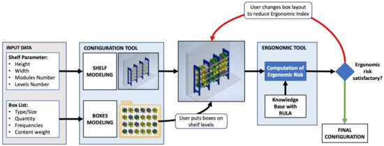 The first task of the configuration tool is to support the geometrical modeling of the shelving and define the models of the boxes with data. The user interacts with the application to establish the geometrical data related to the 3D CAD model of the shelving. At this level, the user must also define and place the boxes on the shelf levels to produce the virtual assembly of the complete shelving. The second task of the tool is to analyze the ergonomic impact related to the shelf (Computation of Ergonomic Risk), considering the box distribution and the related picking frequency (the ergonomic tool).