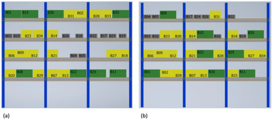Different box distributions for the test case shelving: (a) the first box distribution with ergonomic index 3.81 (SES); (b) the improved box distribution with ergonomic index 3.23 (SES).