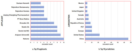 Patent information related to innovation in Lamiaceae-component extraction: (a) top 10 applicants; (b) top 10 jurisdictions.