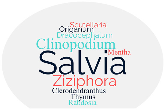 Finally, the analysis of the selected granted patents ensures that the relevant inventions selected describe processes for obtaining different natural compounds using various extraction methods and agents, most of which are valid for many plants, while some focus on genera of Lamiaceae. In this regard, Lamiaceae genera involved in the extraction innovation in this study are specifically genera such as Thymus, Mentha, Origanum, Salvia, Rabdosia, Clerodendranthus, etc. (Figure 4).