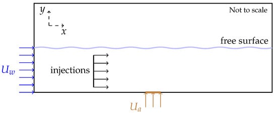 The present paper is built upon a numerical methodology that allows a controlled study of the influence of a bubble curtain device on microplastics dynamics. With that goal, a numerical study was prepared using Ansys Fluent 19.2, following a Reynolds-averaged approach (RAS). Because of that, a turbulence model must be chosen, and for the present study, we select the model. For the wall treatment, scalable wall functions are used. Regarding the water–air interaction, the commonly used Volume of Fluid (VOF) method is employed. To improve the method’s accuracy, an adaptive mesh strategy is used which constantly refines the water–air interface. For the discrete phase modeling, which is responsible for determining the dynamics of the microplastics, the Discrete Phase Model (DPM) is used. The injection of particles is considered to not have any interaction with the continuous phase, following a one-way coupling strategy that is valid when particle concentration is fairly low. The computational domain designed for the present study is presented in Figure 1.