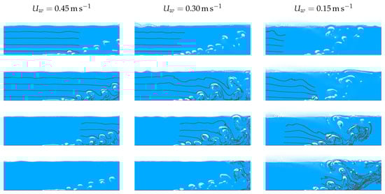 Figure 2 provides insight on the influence of the flow velocity on the bubble plume dynamics. As the ratio increases, there is a higher downstream deflection of the bubble curtain, and thus, the bubbles reach the surface at a much later downstream position. On the other hand, as the ratio decreases, the bubbles are more densely distributed throughout the water depth. Also, note the higher degree of turbulent mixing for the lower water velocities. This may be unfavorable since the turbulent mixing can pull the microplastic particles downwards, which may affect their efficient removal. This raises an important question on the importance of , which must be thoroughly studied in order to identify its optimal value.